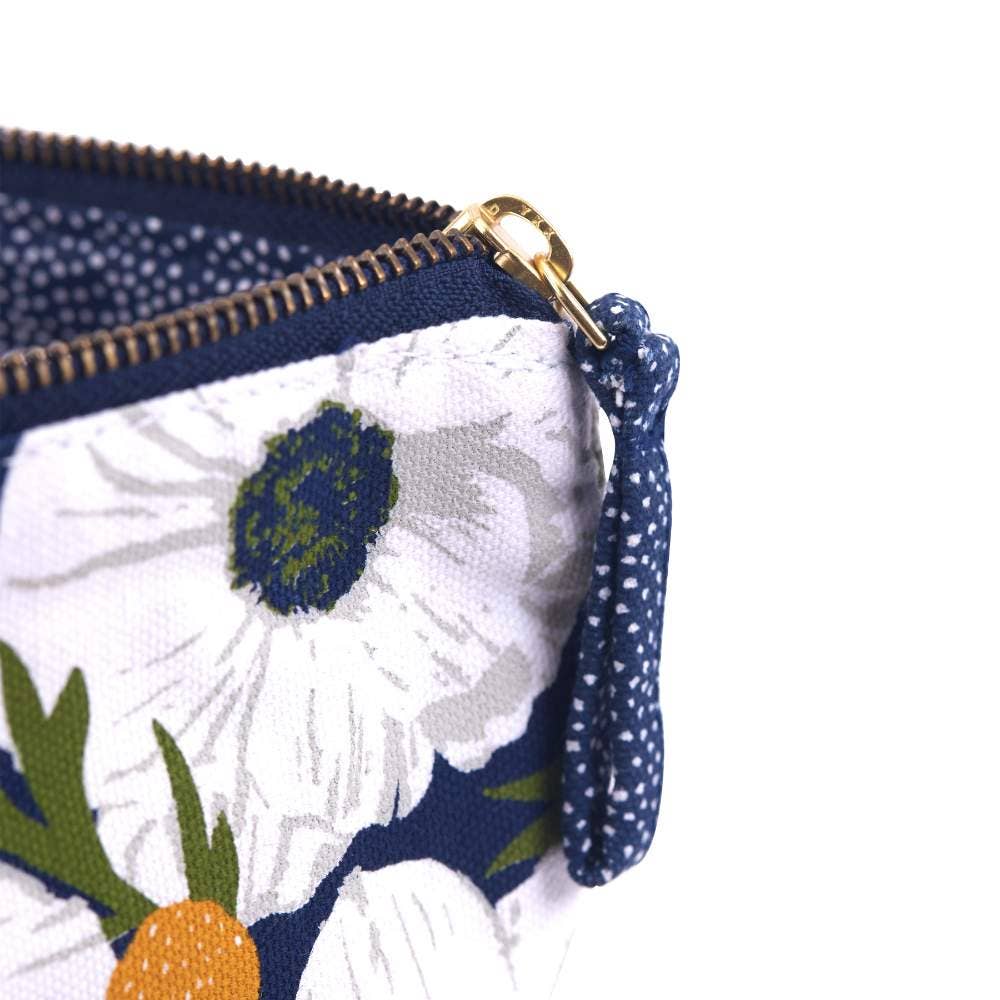 - Materials: 100% cotton canvas, printed looped zipper pulls and pouch lining, gold metal zipper closure